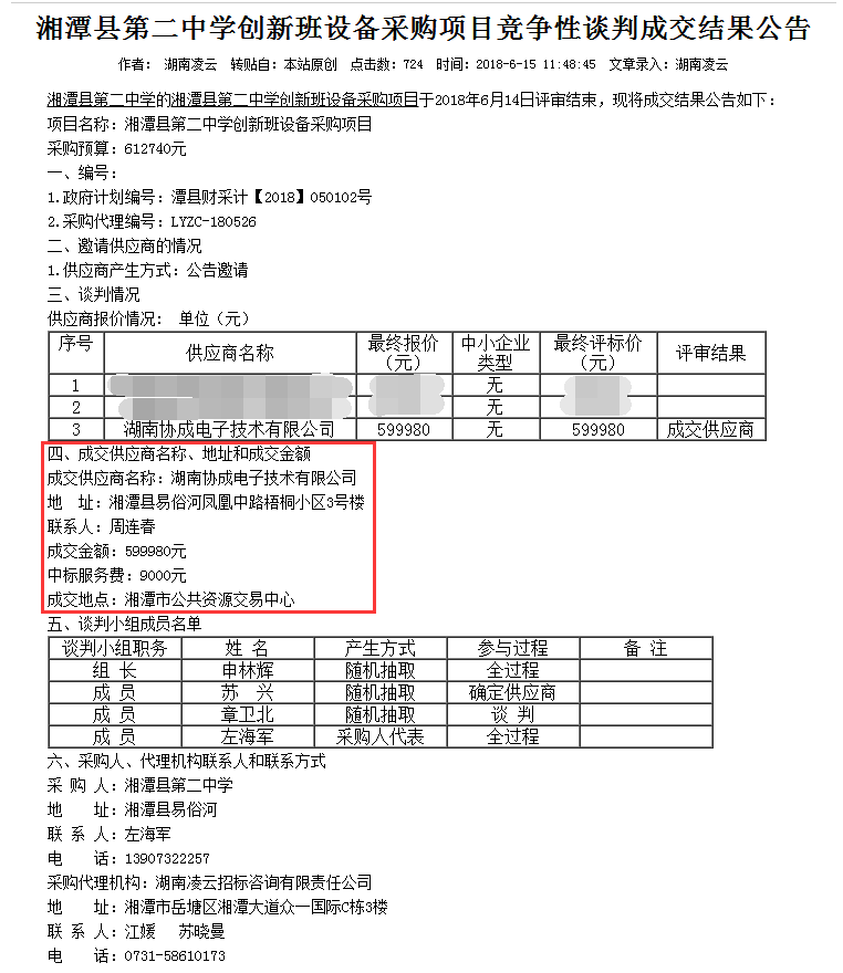 我公司于2018年6月14日,在湘潭县财政局政府采购办的监督和管理下,由湖南凌云招标咨询有限责任公司组织的“湘潭县第二中学创新班设备采购项目”招标活动中,我公司严格遵守《中华人民共和国政府采购法》,凭借雄厚的综合实力,智慧课堂类似项目突出的业绩,得到了采购方单位的认同和赞誉,以599980.00元成功中标!