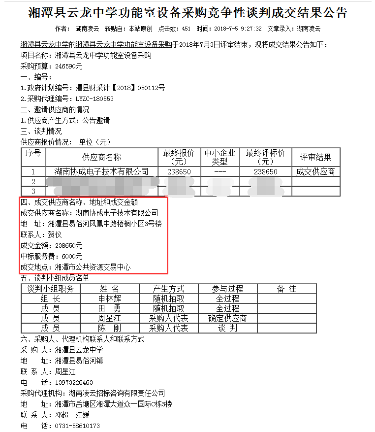 【中标喜讯】湘潭县云龙中学功能室设备采购项目!