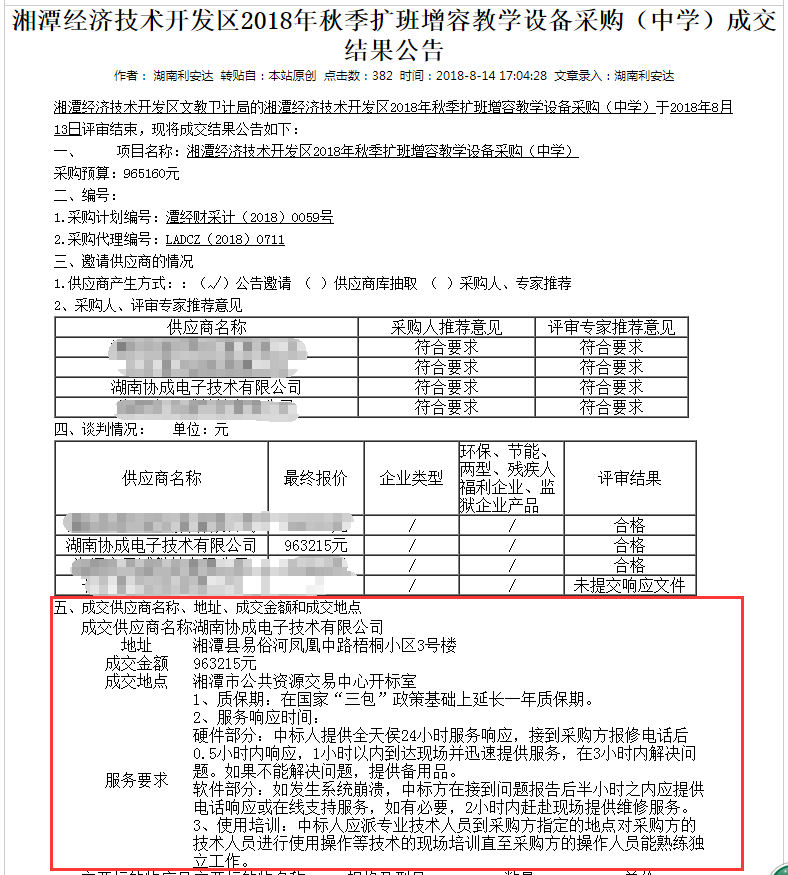 2018年8月13日,湖南协成电子技术有限公司凭借突出的综合实力和完善的产品解决方案再创佳绩,一天内连续中标“湘潭经济技术开区2018年秋季扩班增容教学设备采购(中学)”、“湘潭经济技术开区2018年秋季扩班增容监控改造设备采购(中学)”以及“湘潭县天易水竹学校扩班增容多媒体设备及食堂监控采购”三大项目! 协成电子将始终秉承“以诚取信,以精立业”的管理理念和经营方针,以最好的产品和最优的服务回报客户。