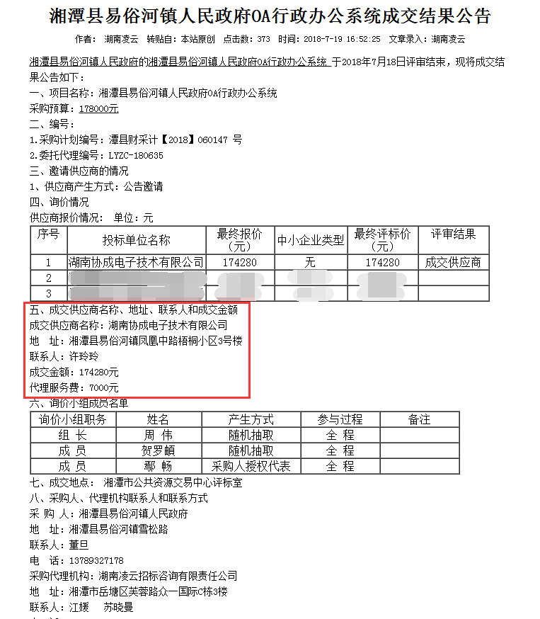 我公司于2018年7月18日,在湘潭县财政局政府采购办的监督和管理下,由湖南凌云招标咨询有限责任公司组织的“湘潭县易俗河镇人民政府OA行政办公系统采购”招标活动中,我公司严格遵守《中华人民共和国政府采购法》,凭借突出的综合实力,以174280.00元成功中标!