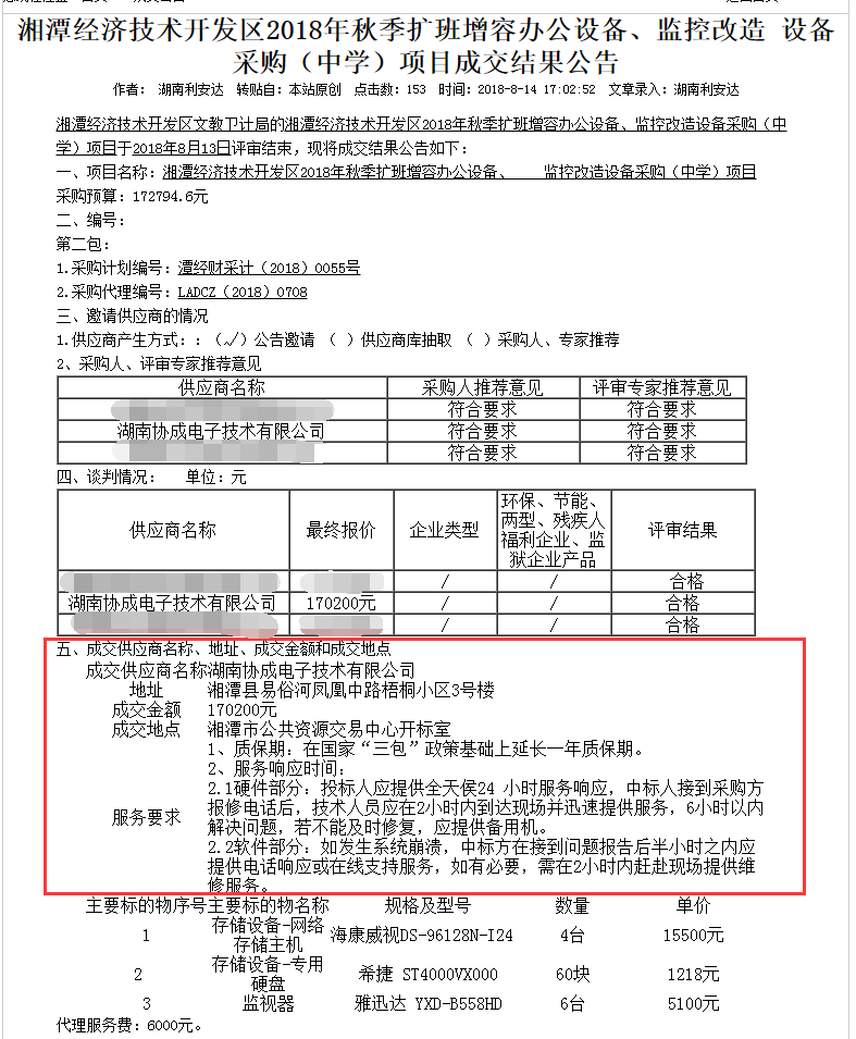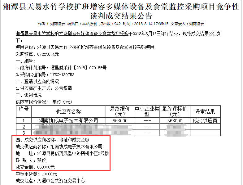 2018年8月13日,湖南协成电子技术有限公司凭借突出的综合实力和完善的产品解决方案再创佳绩,一天内连续中标“湘潭经济技术开区2018年秋季扩班增容教学设备采购(中学)”、“湘潭经济技术开区2018年秋季扩班增容监控改造设备采购(中学)”以及“湘潭县天易水竹学校扩班增容多媒体设备及食堂监控采购”三大项目! 协成电子将始终秉承“以诚取信,以精立业”的管理理念和经营方针,以最好的产品和最优的服务回报客户。